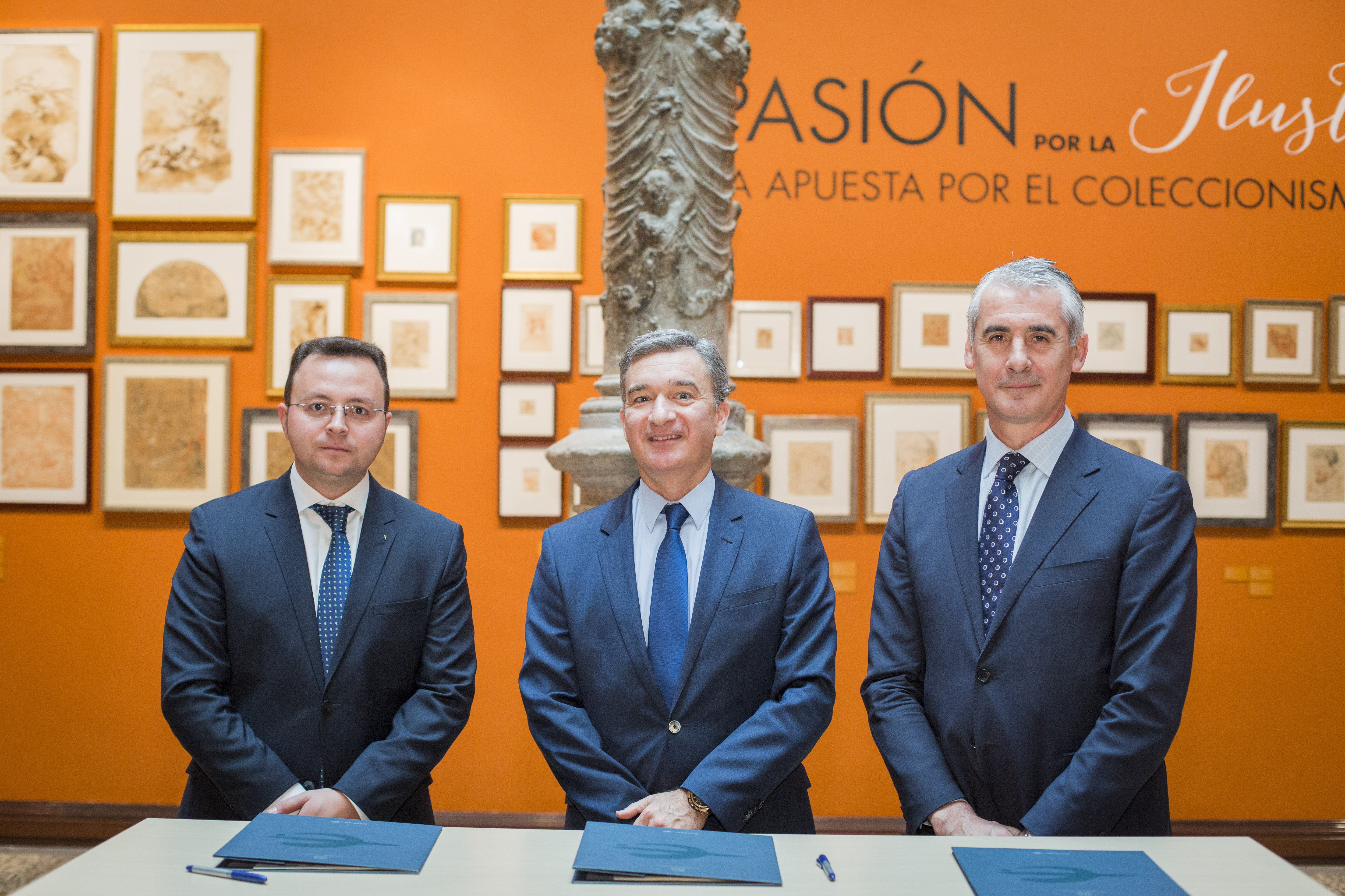 Eduardo Gómez Martín, Director General de ESIC, Víctor Iglesias Ruíz, Consejero Delegado de Ibercaja Banco, Juan Carlos Sánchez Bielsa, Jefe de la Obra Social de la Fundación Bancaria Ibercaja, durante la firma del convenio de colaboración, en la sede central del Banco en Zaragoza